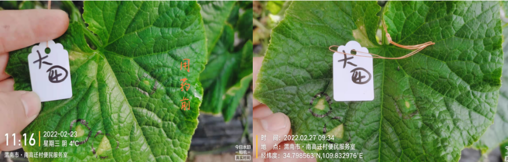 競(jìng)雙750倍+2%春雷霉素750倍防治黃瓜細(xì)菌性角斑病,4條后病斑得到抑制未見(jiàn)擴(kuò)散。