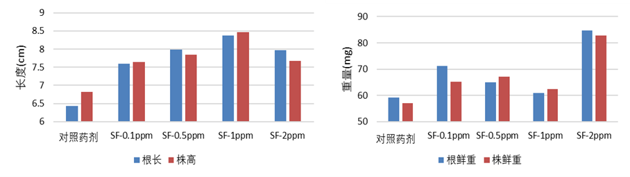 (2)針對(duì)小麥作物:浸種處理后發(fā)現(xiàn),試驗(yàn)范圍內(nèi)的花粉多糖對(duì)小麥株高、根長、株重、根重均具有促進(jìn)作用,其中在2 ppm處理下,相比陽性對(duì)照處理,花粉多糖處理后小麥株高、根長、株重及根重分別增長12%、24%、45%、43%。