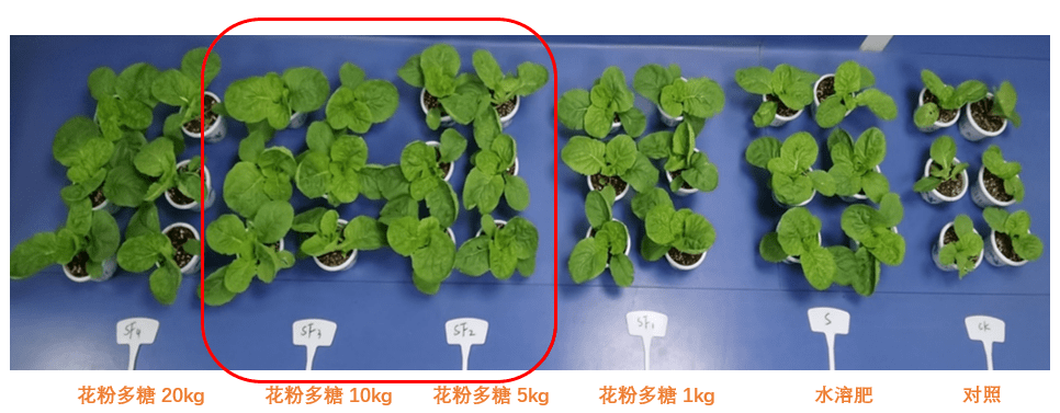 (2)根據(jù)復合肥施用量,設(shè)計減量復合肥20%,同時進行不同用量花粉多糖復配,即全量肥(60kg/畝)、減量肥(48kg/畝)、減量復配花粉多糖3、5、10kg/t。通過測試發(fā)現(xiàn),相比全量復合肥處理,減量+花粉多糖10kg/t處理后,小白菜地上部分鮮重、根長、根重、冠幅、葉長、葉寬分別增加26.5%、42.2%、123.8%、7.7%、1.6%、9.3%,促進效果明顯。結(jié)合成本計算,減量后添加花粉多糖可達到降本增效的目的。